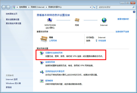 在 "网络共享中心" 点击 "建立一个新的连接或网络" 。