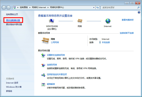 到 "网络和共享中心" 并点击 "更改适配器设置" 。