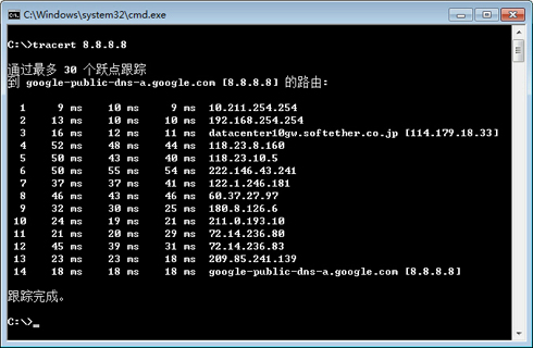 当 VPN 建立时,所有到互联网的通讯将通过 VPN 服务器转发。您可以在 Windows 命令提示中使用
